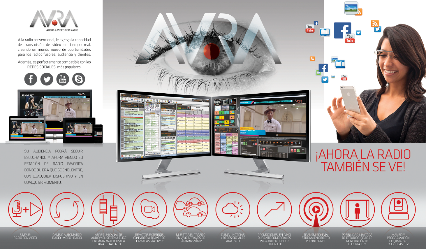Plataforma Multimedia de Radio Visual, Marca: AVRA 2.0 Modelo: AVRA FULL. Sistema integrado con automatización de emisión al aire (Playout) de Audio & Video para estaciones Radio AM/FM & Online.